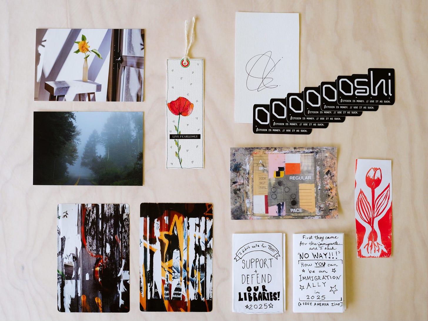 sent us two photographs of layered graffiti and advertising in Bangkok and they are awesome, especially for their covetable rounded corners and the most creative note spanning the two postcards – it blew my mind! sent us a thank you print with our purchase of his dreamy publication Imaginary Landscapes. Also included: a note saying FIND YOUR PLACE. We’re working on it, Davin, thank you! sent over a token of appreciation that I used as a bookmark recently, accompanying me through Elif Shafak’s novel, The Island of Missing Trees. “Live Fearlessly” is the message with a gorgeous poppy, but the reverse also has the most thoughtful note in truly beautiful penmanship. sent us some of his Oshi stickers to disburse into the stickerverse and spread the “Bitcoin is money” message. Colin also has an amazing signature that I seriously envy. Am I the only one still signing my name the way I learned in third grade? sent a couple postcards our way with our purchase of his Protect The Network zine. We unabashedly display these as artwork around the house…And finally Lara Frederick sent me this surprise zine loot as part of the Zinestack chain mail loop and I just love the handmade urgency behind the zines, no straight cut lines, and heck yeah, “Support + Defend our Libraries!”