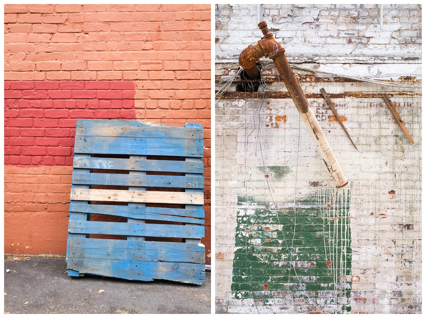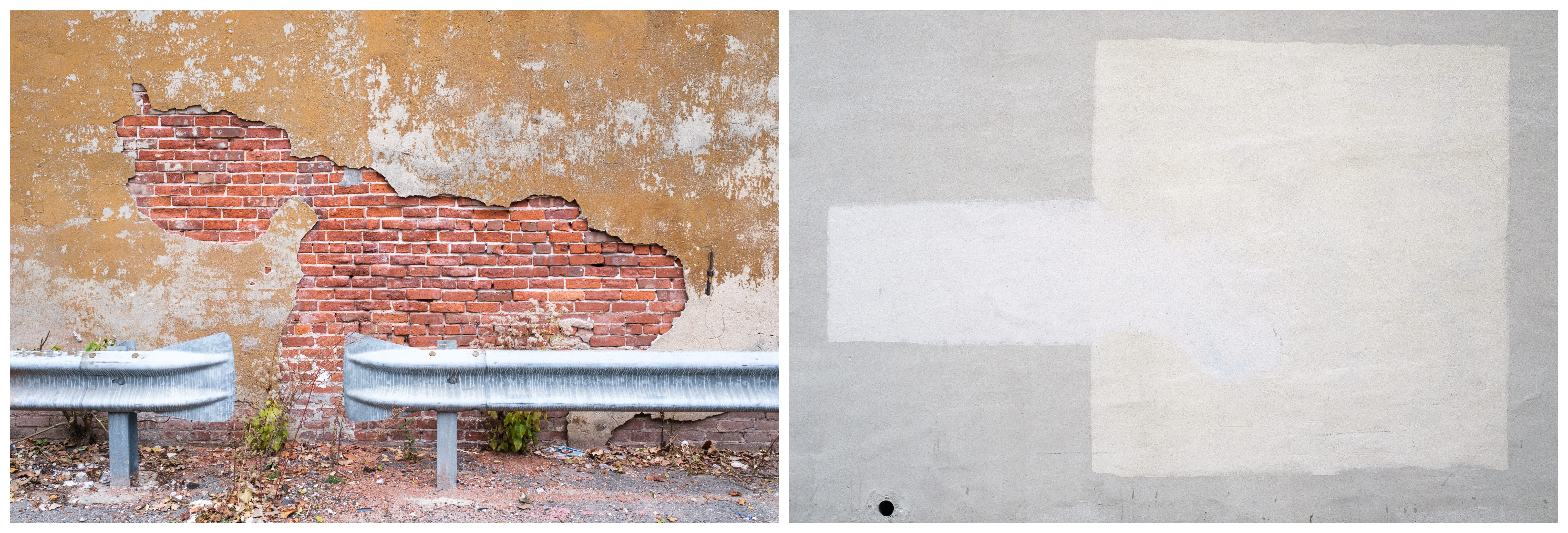 Below, crumbling stucco reveals a continent of bricks hugged close by guardrails. Graffiti removal makes its own case to be considered as minimal abstract art. In each photograph, like the telephones above, the photographs are about removal. Whether by accident or on purpose, there is no photograph worth taking if something hadn’t been removed.