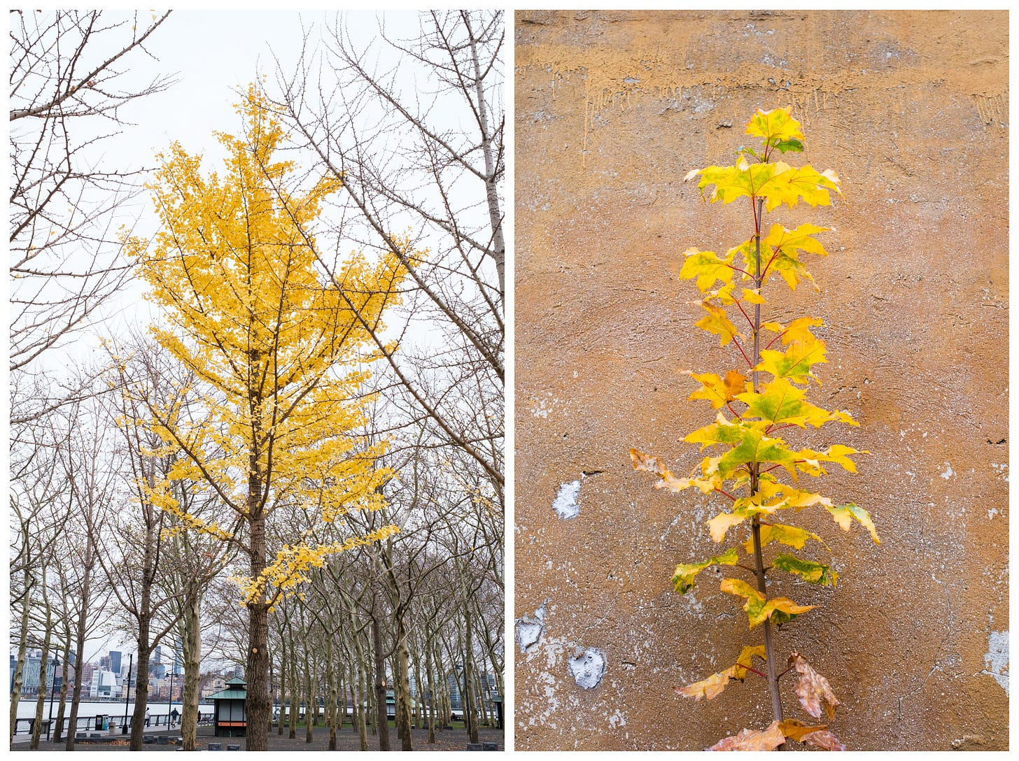 The nature in these photographs below are equally worth their feature, one planted purposefully, the other definitely a weed – but both sinking roots down and shooting foliage out into the urban landscape. Any other time of year, these photographs wouldn’t have been taken, but the late yellow foliage, clinging on longer than the rest, demands to be captured.